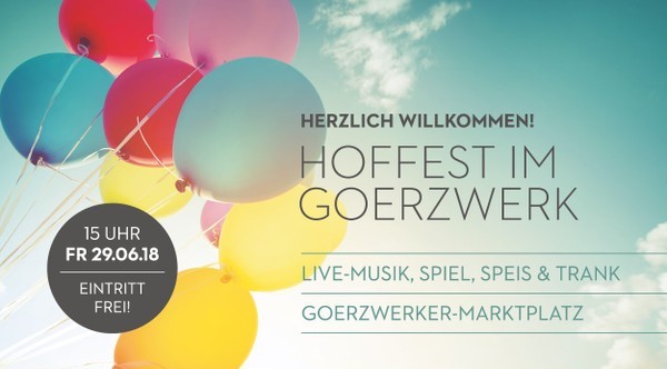 Am 29. Juni haben wir zum alljährlichen Hoffest im Goerzwerk geladen. Bei feinstem Sonnenschein gab es herzliche Begegnungen und konstruktive Gespräche, ganz im Sinne unserer Goerzwerk-Community. An den vielen Marktständen tummelten sich interessierte Besucher und informierten sich über spannende Projekte und Arbeiten der Goerzwerker. Während die kleinsten Besucher in den Hüpfburgen tobten, erprobten die etwas Älteren ihr Talent beim Stand-Up-Paddling auf einem eigens von uns aufgestellten Pool, im Crossfit, beim E-Bike-fahren oder an den vielen anderen Erlebnis-Spots. Bis in den späten Sommerabend hinein wurde gelacht, gestaunt, geschmaust und zu Musik unserer coolen Live-Bands getanzt.